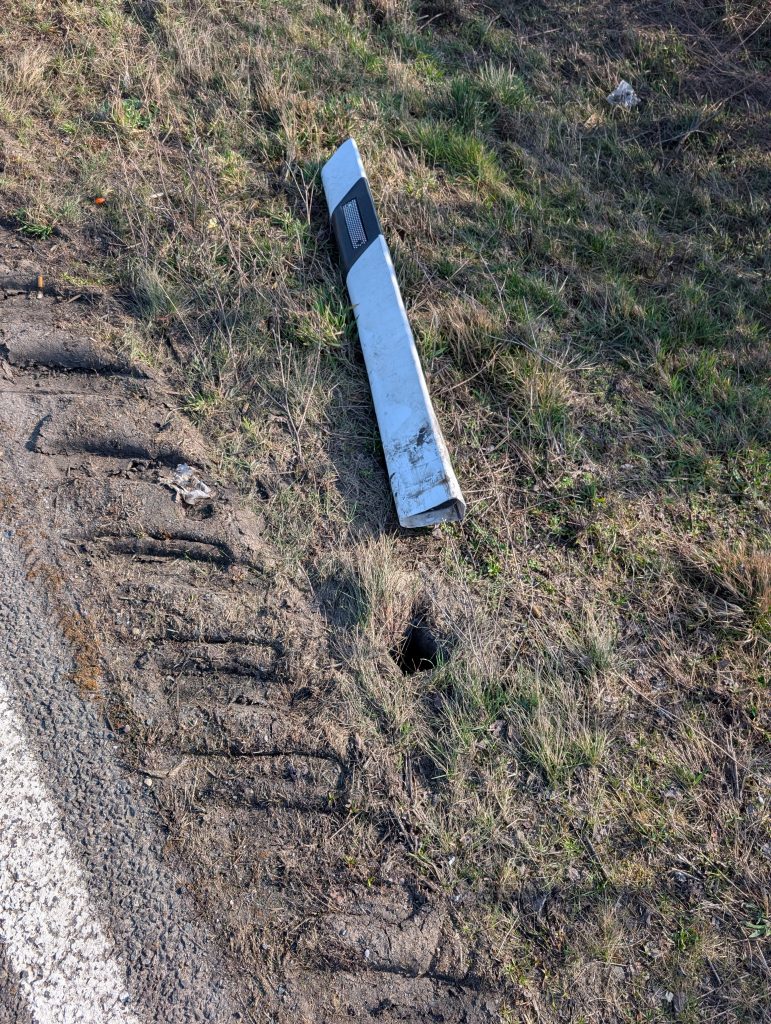 Ein Straßenpfahl, der offenbar umgefahren worden war, lag im Gras.
