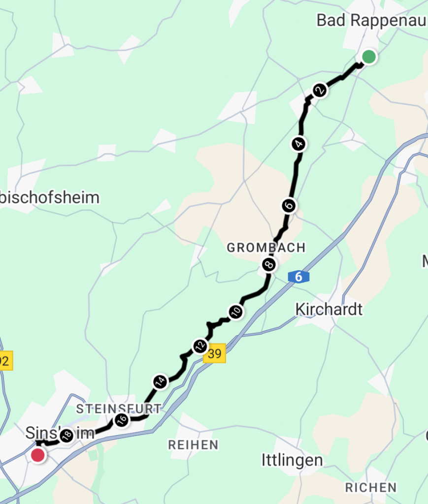 Nach exakt 20,77 Kilometern und genau um 12.15 Uhr ist das Ziel „Hotel Bär“ in Sinsheim erreicht. Das Zimmer war bereits bezugsfertig, das hatte ich am Vortag organisiert. Rucksack ab, unter die heiße Dusche – für den Moment war die Pilgeretappe beendet.