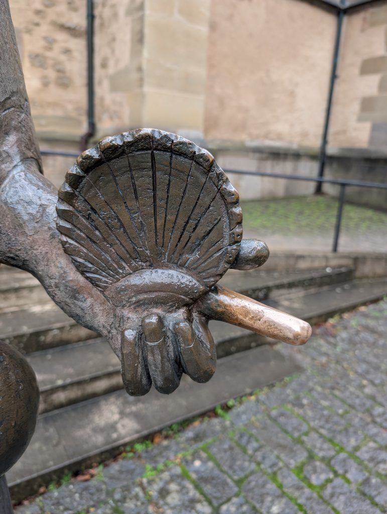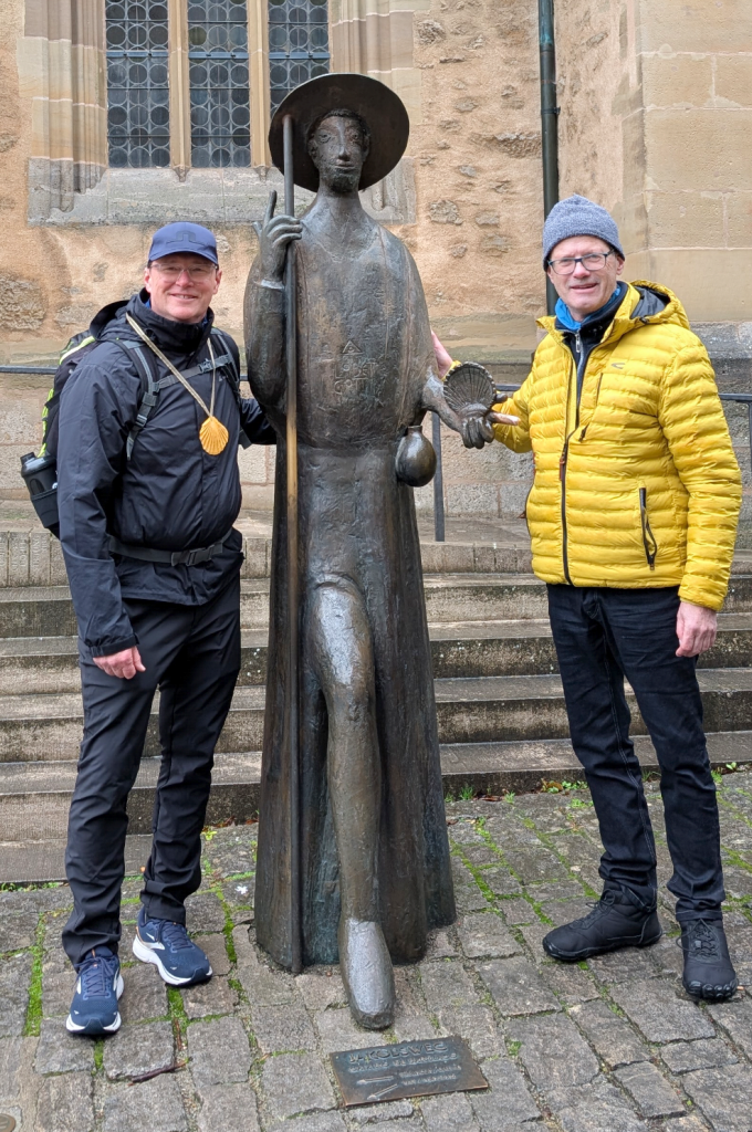 Gleich zu Beginn verfielen Thomas und ich in Gespräche, die so intensiv waren, dass man sie kaum jemandem weitererzählen möchte. Themen, tiefe Gedanken, viel ehrliche Offenheit – als würde man nicht wandern, sondern Schritt für Schritt gemeinsam einen alten Dachboden entrümpeln. Und mitten hinein in diese Stimmung überreichte ich Thomas eine goldene Pilgermuschel als Symbol für unseren gemeinsamen Weg. Die Muschel hatte meine Frau Renate kunstvoll vergoldet, das Original stammt aus Frankreich – ein Geschenk von Freunden. Thomas war sichtlich bewegt.