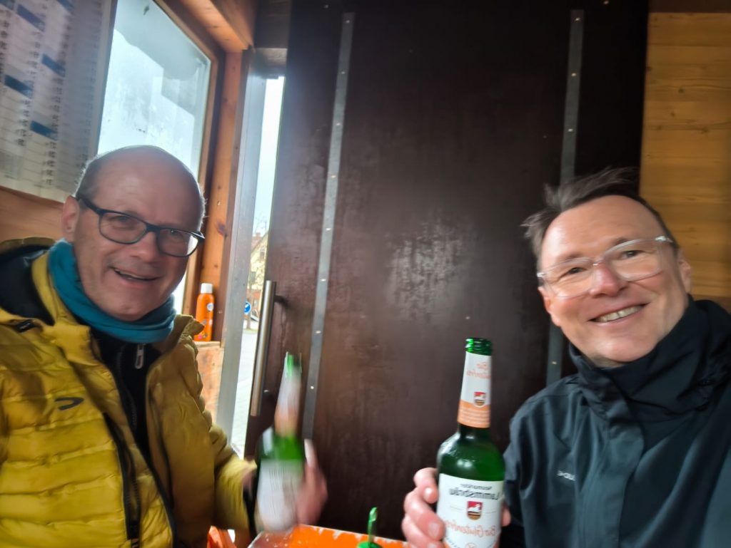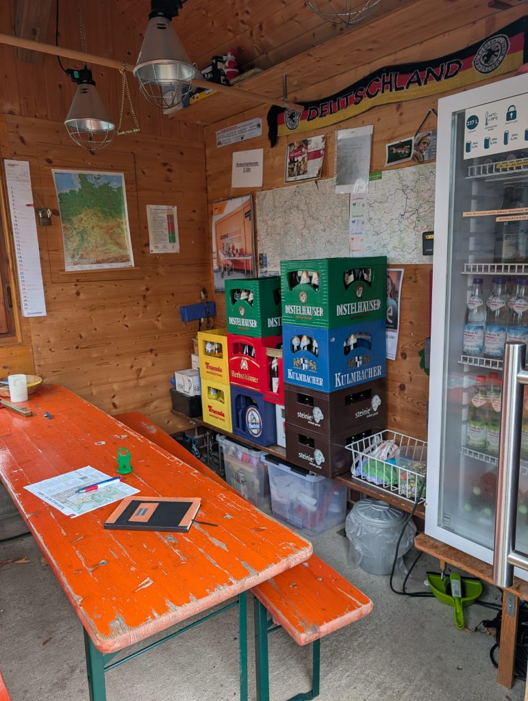 Kurz vor Enzenweiler bekamen wir von einer Busfahrerin noch einen Tipp: Wir sollten unbedingt die legendäre Bushaltestelle von Funkstatt besuchen. Sie hätte uns sogar mitgenommen, doch das wäre zu einfach gewesen. Also liefen wir den großzügigen Umweg – und wer hätte gedacht, dass ein schlichtes Wartehäuschen als Dorfkneipe durchgeht? Vollbestückt mit Getränken, 2-Uhr-Sperrstunde, Geschichten, die im Holz stecken. Wir gönnten uns ein Biobier und grinsten wie zwei Schuljungen, die etwas Verrücktes entdeckt haben.