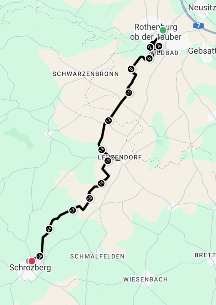 Dort begann der Weg offiziell mit Thomas bei Kilometer 0,0 und 431 Metern Höhe, doch gefühlt hatte der Tag da schon eine ganze Strecke hinter sich. Die Route sollte uns über Enzenweiler (7,3 km; 473 m), weiter nach Schöngras (10,4 km; 479 m), bis wir in Schrozberg die 18,9 Kilometer hätten vollmachen sollen. Am Ende wurden es allerdings statt der geplanten 18,9 gleich satte 27,4 Kilometer. Und keiner von uns hat sich beschwert.